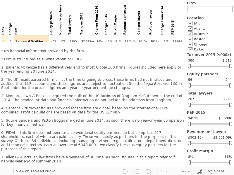 Global 100 2015 – Main Table Legal Business8 July 2015Financial resultsGlobal 100 2015 Your limit of 1 article in 30 days is up. Please login for full access or subscribe. Corporate users - click here for simple access (no password needed). For more information, please contact [email protected] Related ContentMore in this categoryBCLP revenue bounces back as McDermott breaks $2bnWhite & Case breaks $3bn revenue barrier while PEP jumps 27%Freshfields US revenues rise 26% as firm breaks £2bn mark for first timeComment: The Global 100 – so much for the City comeback as US leaders land the big blowsThe Global 100 2015The Last Word: Progress ReportTransatlantic firms outstrip peers on five-year PEP growth, LB100 data revealsThe LB100 ranked by PEP: firms push partner profits to new heights as associate pay debate rumbles onA good time to be mid-tier: private equity interest on the rise as mid-market thrives