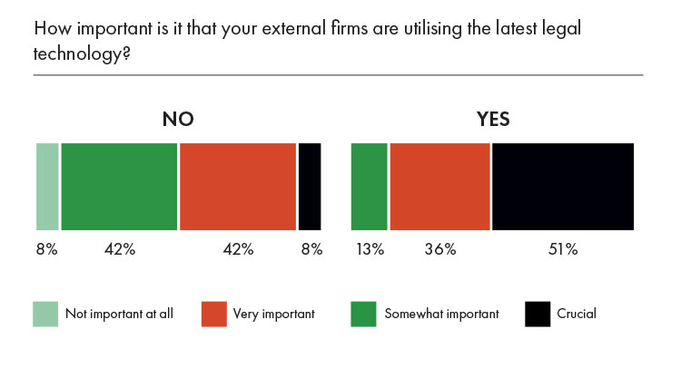 Interestingly, when it comes to using technology, looking to external law firms for guidance remained a rarity. Only 35% of our respondents said that they were satisfied with the use of technology by their external firms, despite 86% saying it was somewhat or very important to them that their law firms keep abreast of new technologies. Only 26% said that they looked to their external firms for guidance when it comes to new technology, with even fewer – 18% – saying that their firms had offered to share or help with the implementation of tech systems.