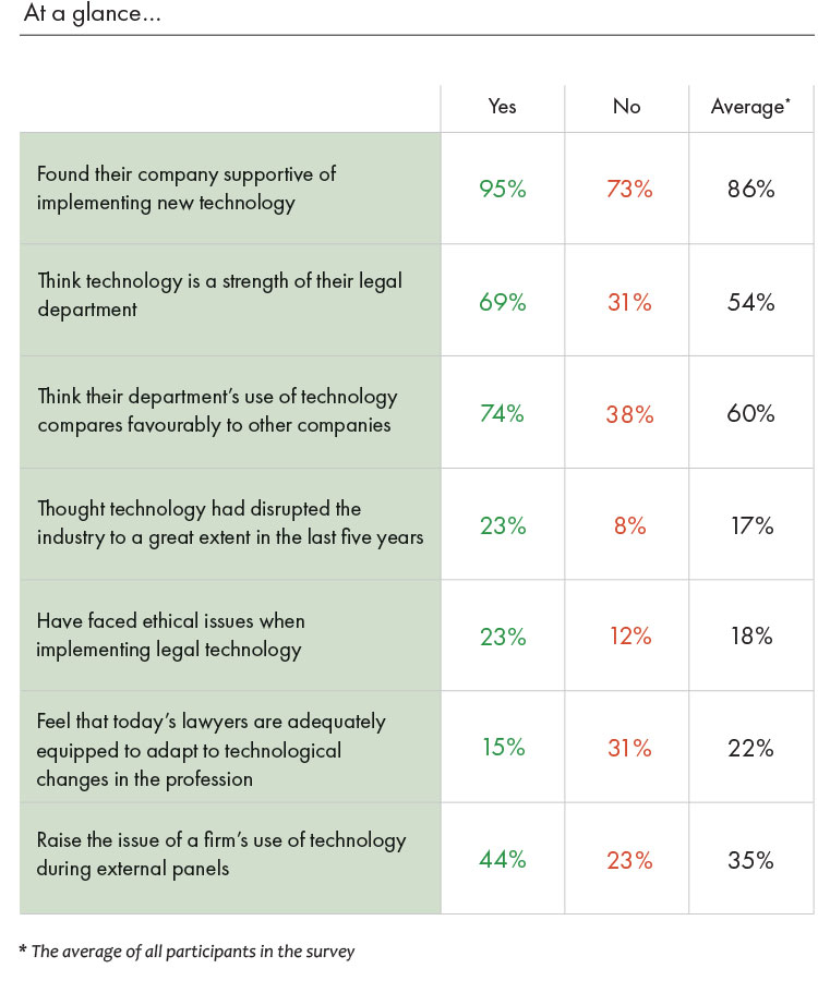 Making a first foray into legal tech can be a daunting experience for some legal departments. For a profession that (whether fairly or not) retains the reputation of being technological luddites, having the support of the wider organisation when taking the first steps with legal tech – or expanding on a positive start – can make all the difference, according to the in-house counsel that participated in our research.